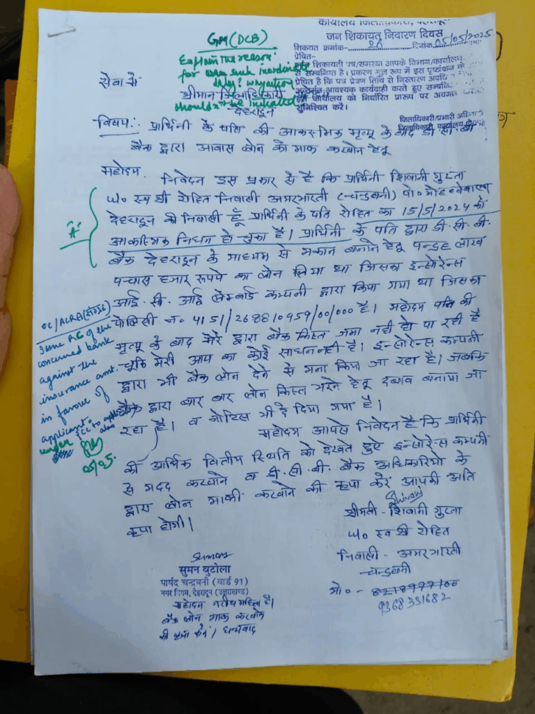 दरअसल जिलाधिकारी के जनता दर्शन कार्यक्रम में शिवानी गुप्ता पत्नी स्व0 रोहित निवासी अमर भारती, चन्द्रबनी अपनी फरियाद लेकर पहुंची थी। शिवानी गुप्ता ने बताया कि उनके पति द्वारा डीसीबी प्रा0 लि0 बैंक से 15.50 लाख का ऋण लिया था, जिसका बीमा आईसीआई लोंबार्ड कंपनी द्वारा किया गया था। उनके पति का 15 मई 2024 आकस्मिक निधन हो गया था। शिवानी गुप्ता ने बताया कि पति की मृत्यु के बाद उनकी आय का कोई साधन न होने के कारण बैंक किस्त जमा नही हो पा रही है। बीमा कम्पनी द्वारा बैंक लोन देने से मना किया जा रहा है।